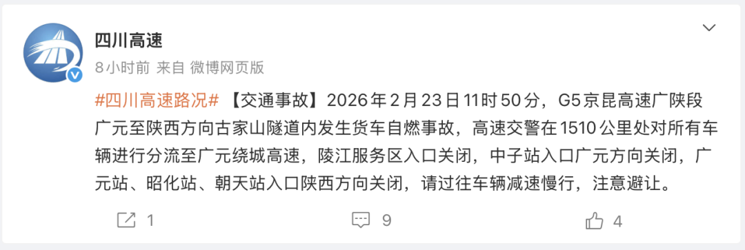 四川省交通运输厅高速公路管理局官方微博也于23日中午发布提示,提醒过往车辆注意避让。