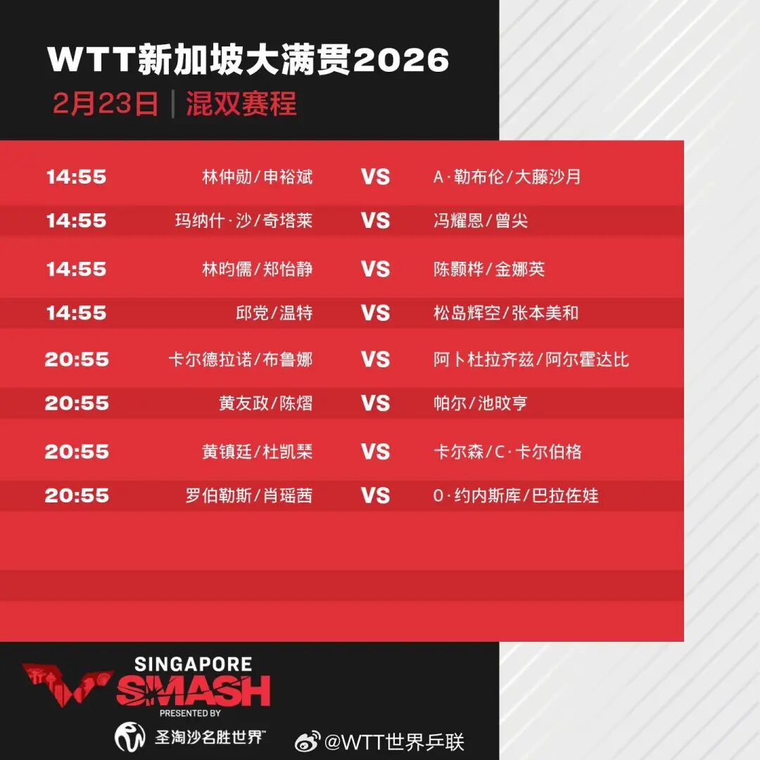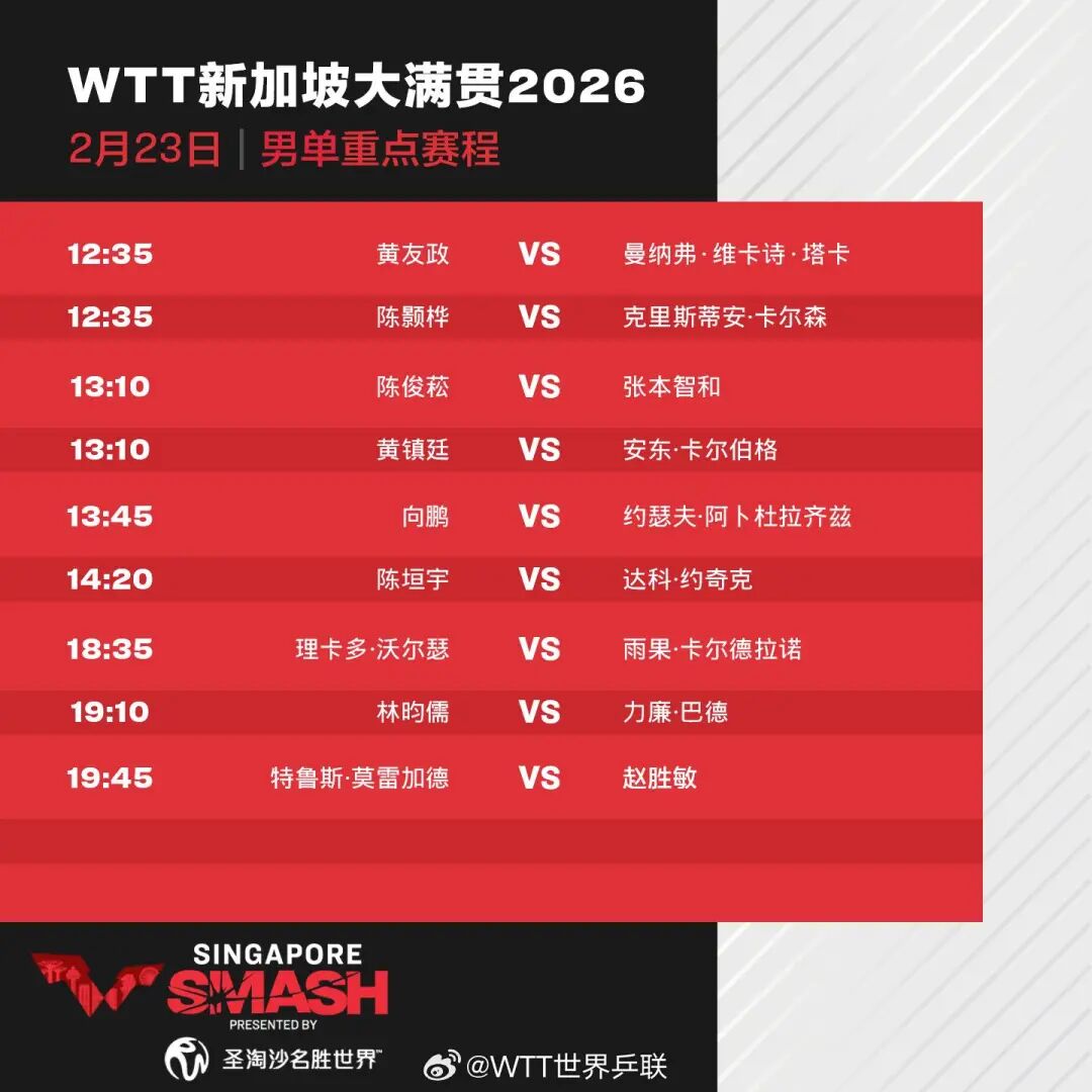 今天(23日),2026年WTT新加坡大满贯进入正赛第二天,孙颖莎、蒯曼、王艺迪、向鹏和陈垣宇等出场。具体赛程如下: