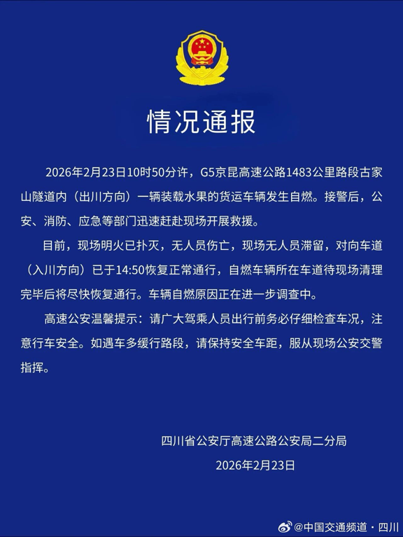 2026年2月23日10时50分许,G5京昆高速公路1483公里路段古家山隧道内(出川方向)一辆装载水果的货运车辆发生自燃。接警后,公安、消防、应急等部门迅速赶赴现场开展救援。