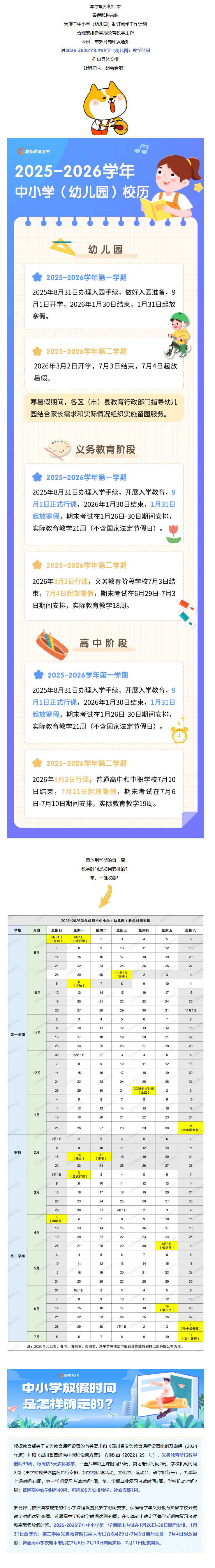 2025—2026学年第二学期,2026年3月2日至7月4日(义务教育阶段)/7月11日(高中阶段),实际教育教学分别为18周、19周。