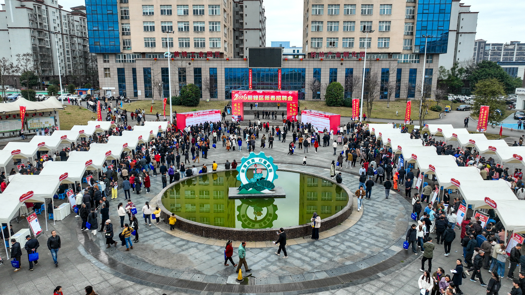 2月24日,广安市前锋区2026年“春风送岗促就业 真情相助暖民心”新春大型招聘会在前锋工业园区广场举行。上午8时许,各企业展位整齐排列,岗位信息一字排开,各乡镇“求职专车”陆续抵达。现场人头攒动,一派火热景象,来自全区各乡镇的求职者穿梭于展位之间,咨询岗位、填写意向表。