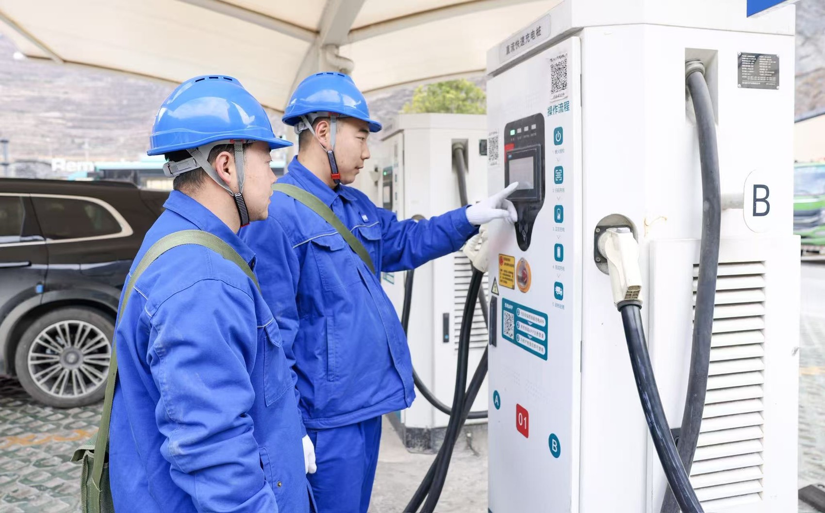 近日,国网阿坝汶川县供电公司威州供电服务站员工对汶川县雁门综合服务区充电站进行巡视检查,保障充电设备安全稳定运行。(廖斌 摄)