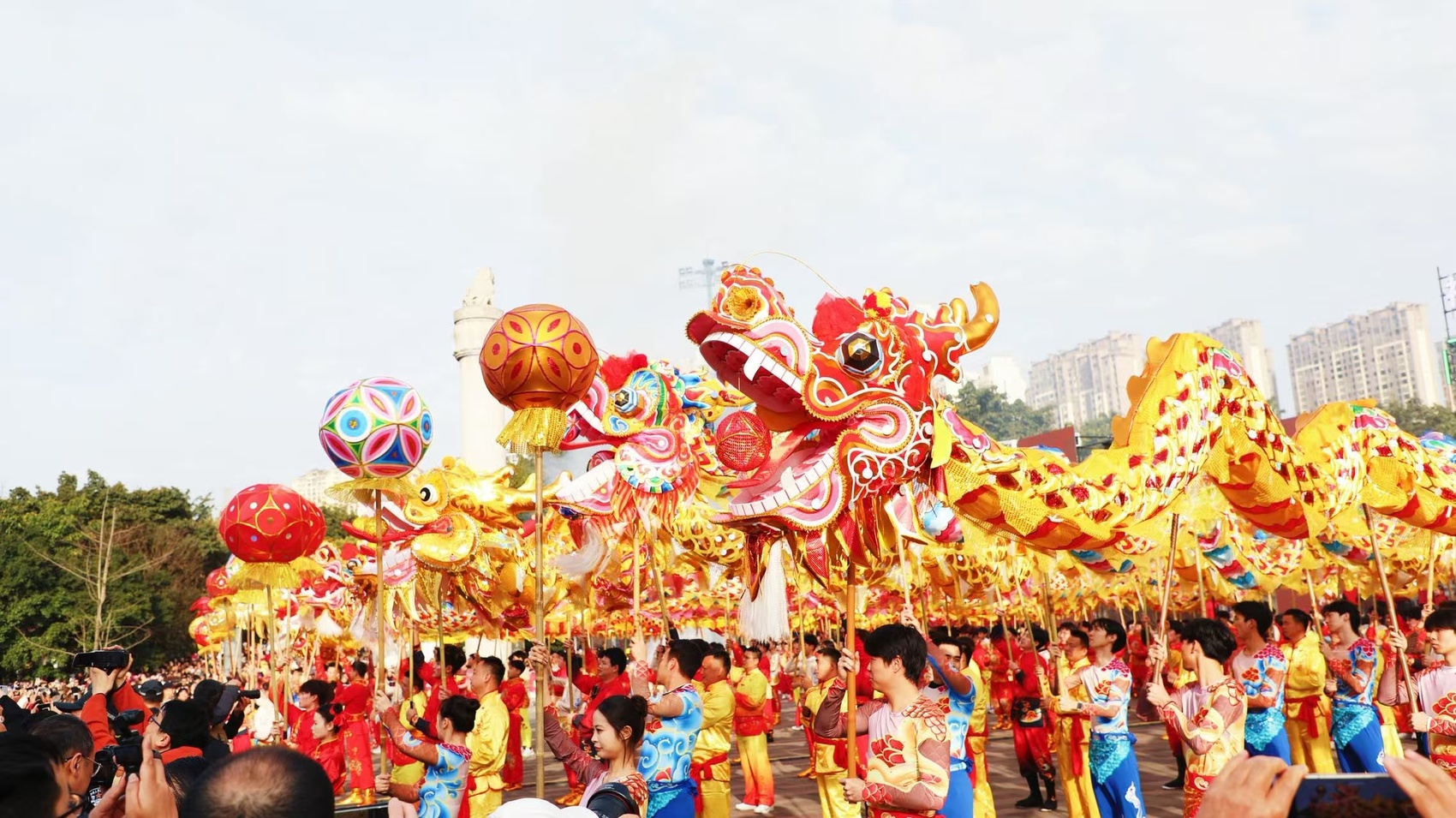 当天上午8点40分,在激扬的锣鼓声、鞭炮声中,阔别多年的舞龙巡游民俗活动正式拉开帷幕,来自全市各个镇街的13条祥龙列队完成集体亮相和点睛仪式后,从莲峰公园出发,开启了全长约2.6公里的城区巡游。