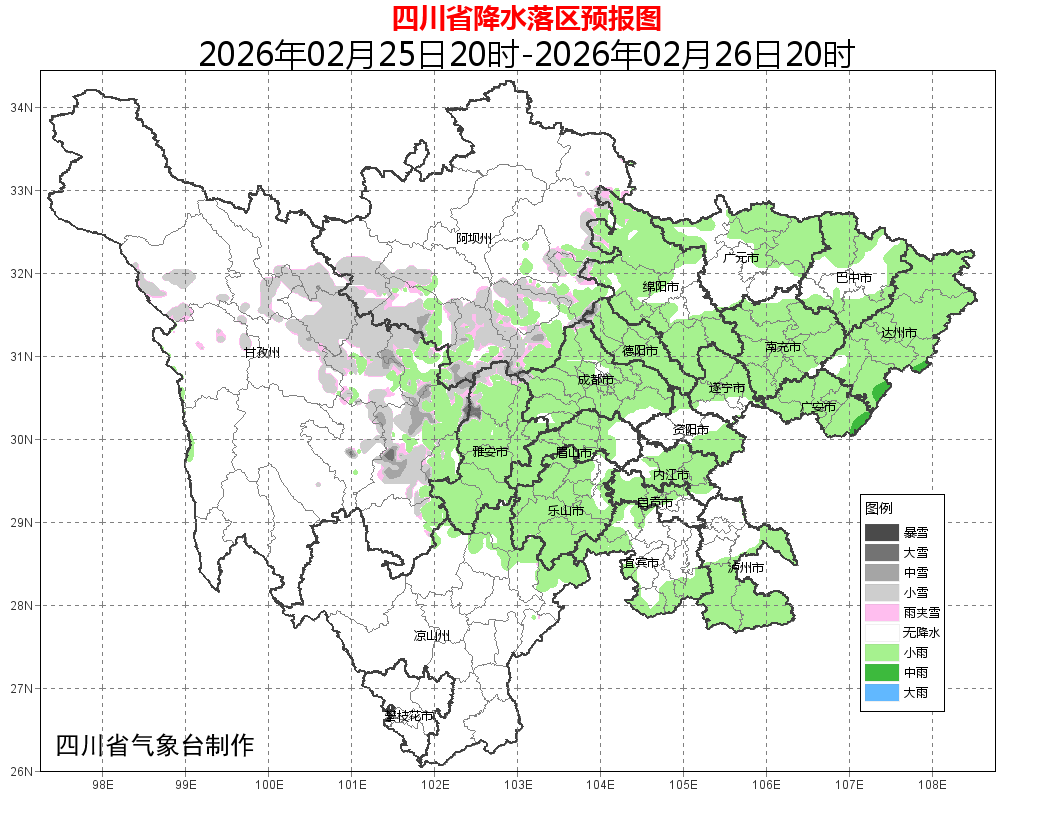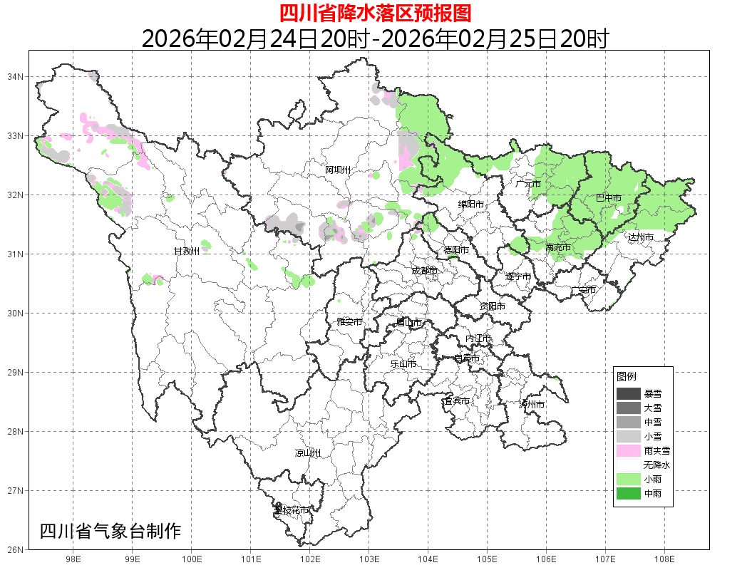 25日晚上到26日白天:盆地夜间阴天有分散小雨,白天多云;阿坝州东部南部、甘孜州北部东部和凉山州东北部阴天间多云有阵雪(雨),局部中雪,川西高原和攀西地区其余地方多云间晴。
