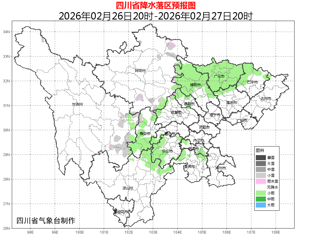 26日晚上到27日白天:盆地大部多云间阴,西北部和西南部有分散小雨;川西高原东部和凉山州东北部多云间阴天有分散阵雪(雨),川西高原和攀西地区其余地方多云间晴。