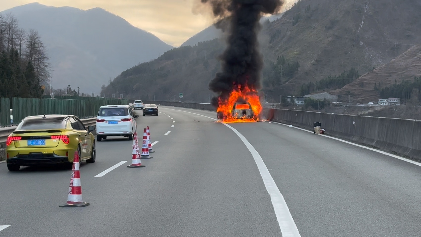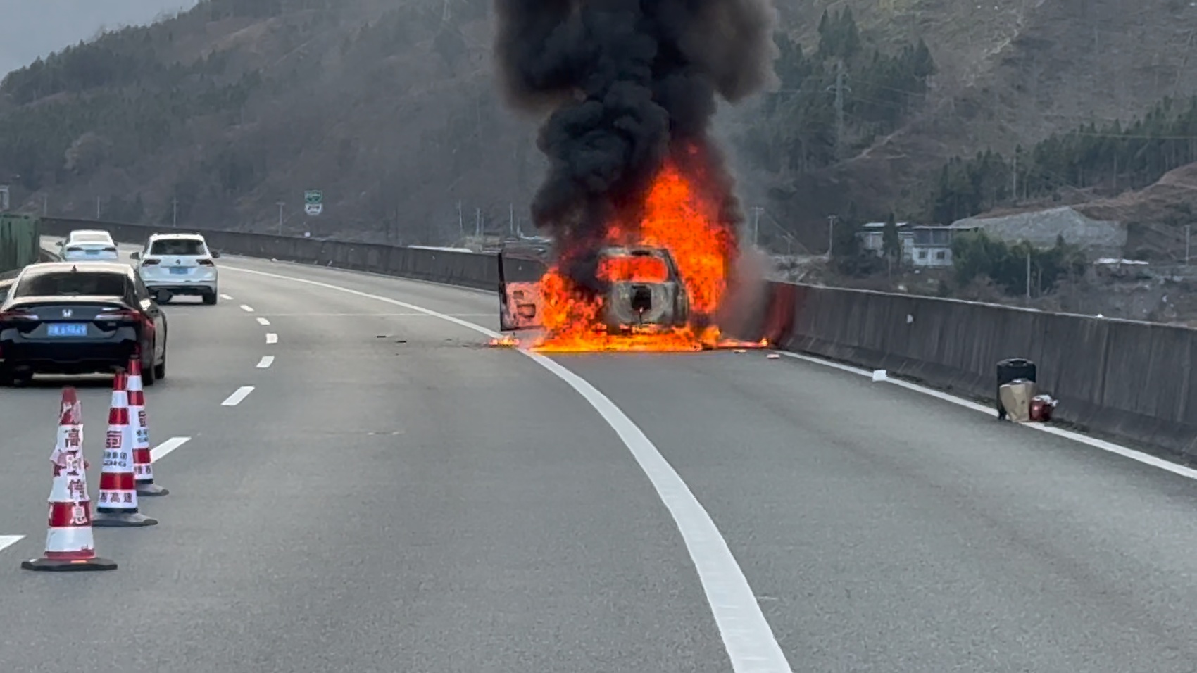 2月24日17点17分,四川高速公安六分局接群众报警:G5京昆高速公路雅西段2091公里处(成都往西昌方向),一辆小型SUV发生自燃,车内载有2人。