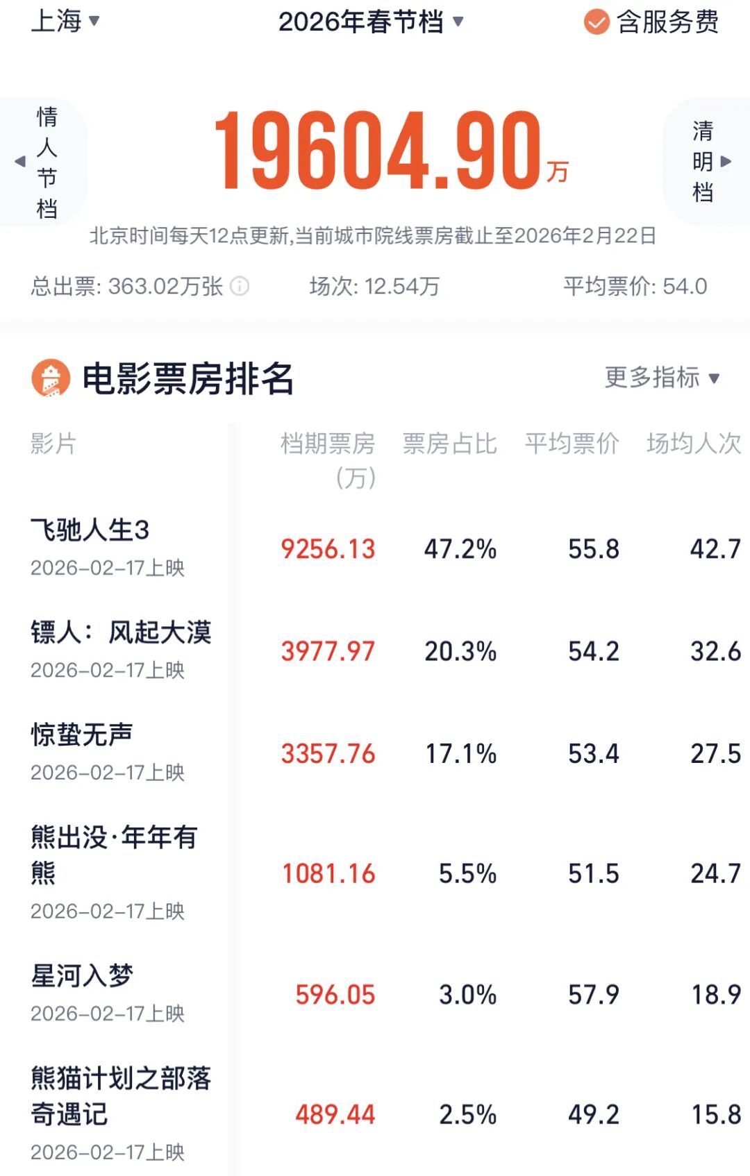 城市票房方面,上海已连续5年蝉联春节档城市票房冠军,今年依旧表现强势,核心数据全部稳居全国榜首。据统计,截至2月23日22时,上海为春节档贡献票房1.96亿元,观影人次达362万,放映场次超12.5万场,三项数据均位居全国城市第一,营业影院数、银幕数、排片场次均为全国第一,为票房领跑奠定了坚实基础。