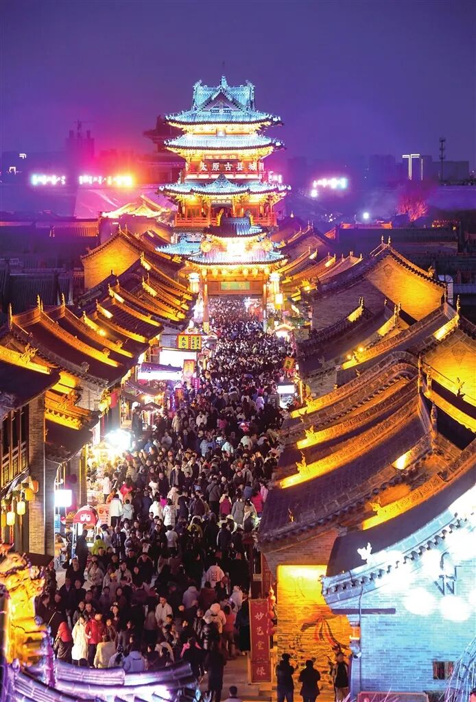 春节假期,我市文旅景区年味浓郁、人气高涨。图为 2月22日晚,太原古县城内灯火璀璨、游人如织。
