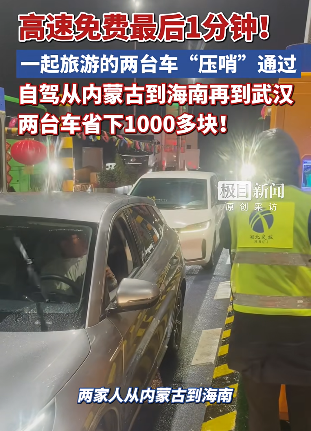 23日23时59分,一辆蒙A牌照车辆“压哨”通过龚家岭收费站。车主王先生说,春节假期他和朋友自驾从内蒙古到海南、广东玩了一趟,再从广东开到武汉,两台车估计省了一千多元通行费。
