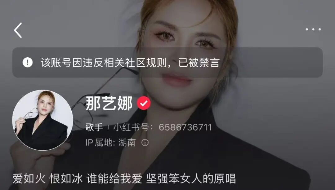 在小红书平台上,那艺娜账号显示“因违反相关社区规则,已被禁言”。
