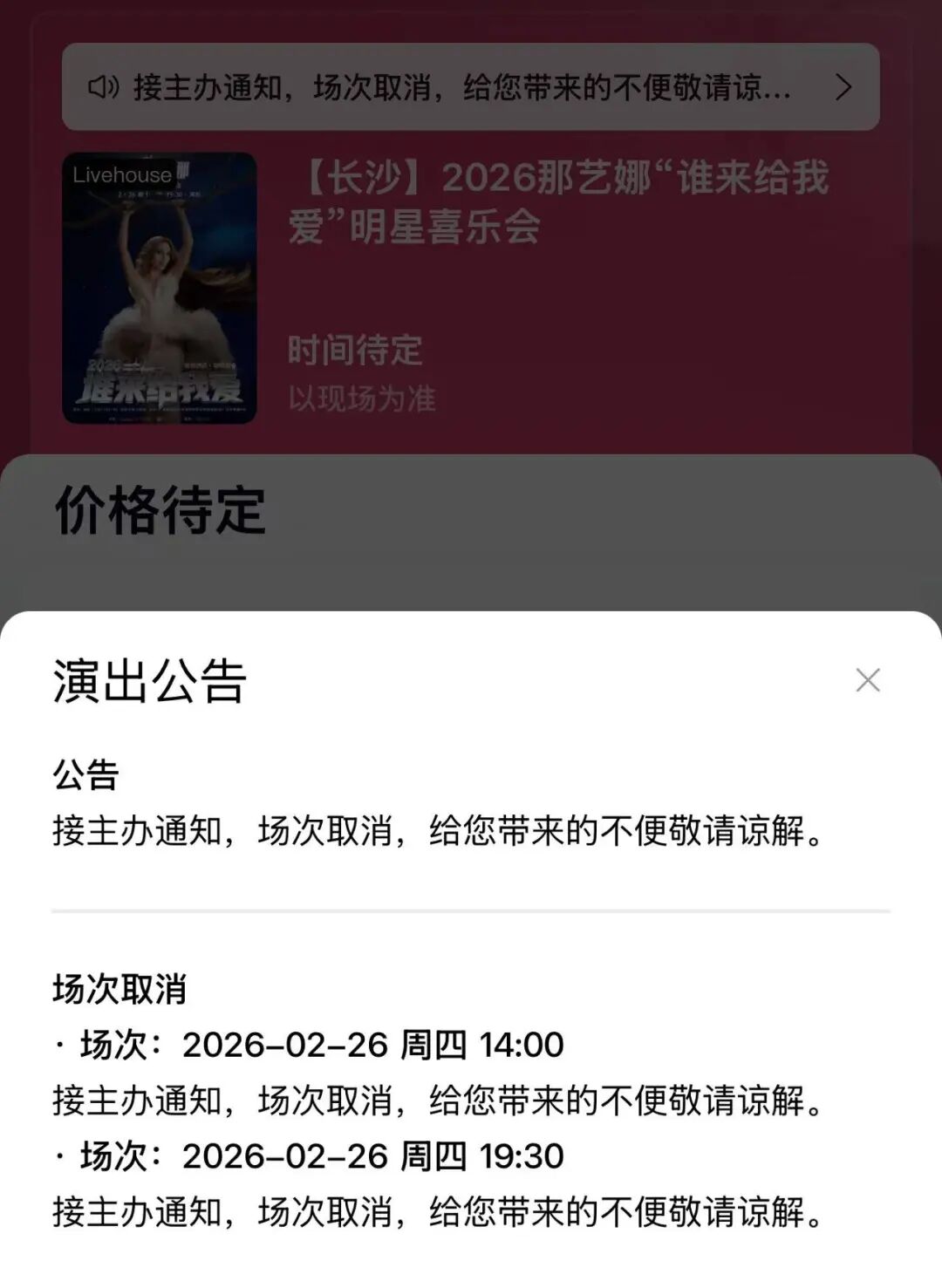 24日上午,大麦平台显示,那艺娜在长沙的两场演出均取消,平台提示为“接主办通知,场次取消”。