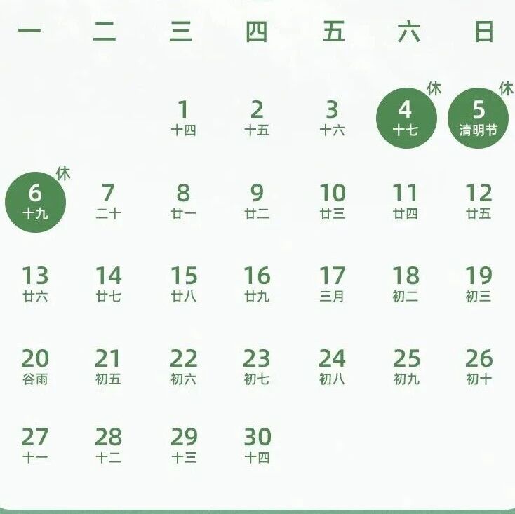 4月4日(周六)至6日(周一)放假