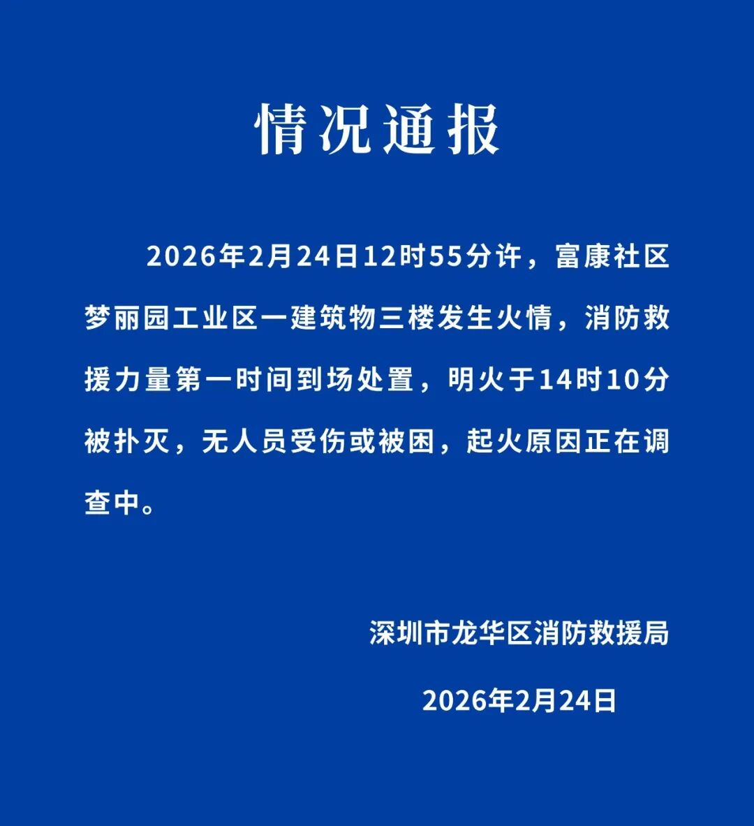 2026年2月24日12时55分许,富康社区梦丽园工业区一建筑物三楼发生火情,消防救援力量第一时间到场处置,明火于14时10分被扑灭,无人员受伤或被困,起火原因正在调查中。