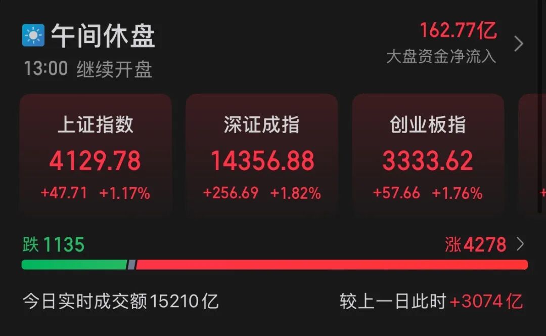 截至午间休盘,沪指涨1.17%报4129.78点,深成指涨1.82%报14356.88点,创指涨1.76%报3333.62点。