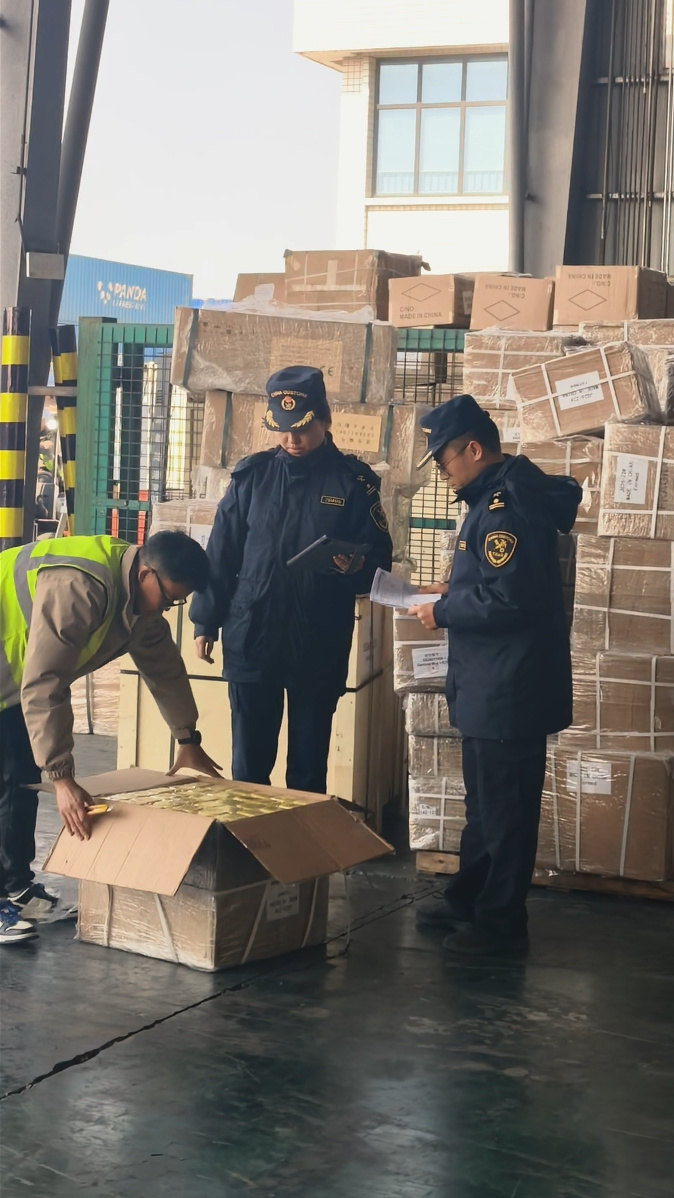 △2月11日,成都铁路口岸多式联运海关监管中心,成都海关所属青白江海关两名关员对货物进行监管查验。
