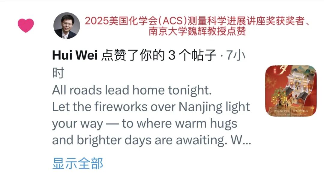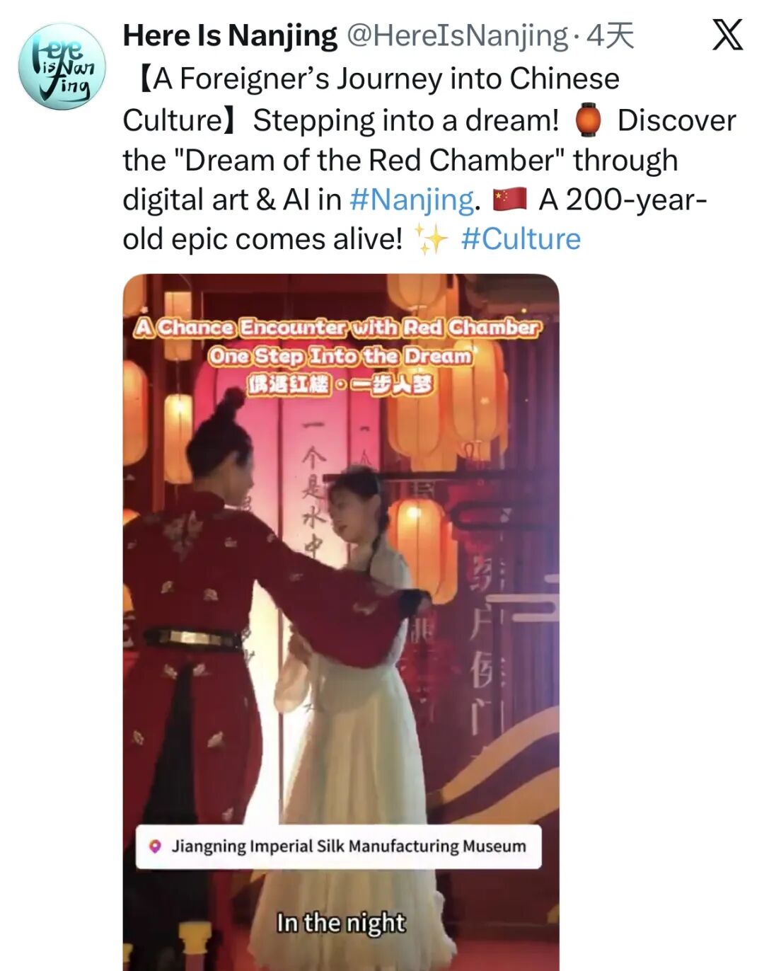 Discover Nanjing紧扣南京新春线下活动,全方位展现南京春节的时尚活力与城市魅力,获联合国新闻秘书埃尔娜拉·巴伊纳扎罗娃点赞,秘鲁移动可持续发展咨询机构点赞、转发。账号同时聚焦南京特色文化体验,分享江宁织造博物馆的“大梦·红楼”沉浸式演出,获得西班牙演讲者、选美比赛教练亚历山大点赞并转发;账号还发布了南京饮马巷年俗视频,还原老城新春烟火气息,获巴利阿里群岛高级音乐学院教授点赞。