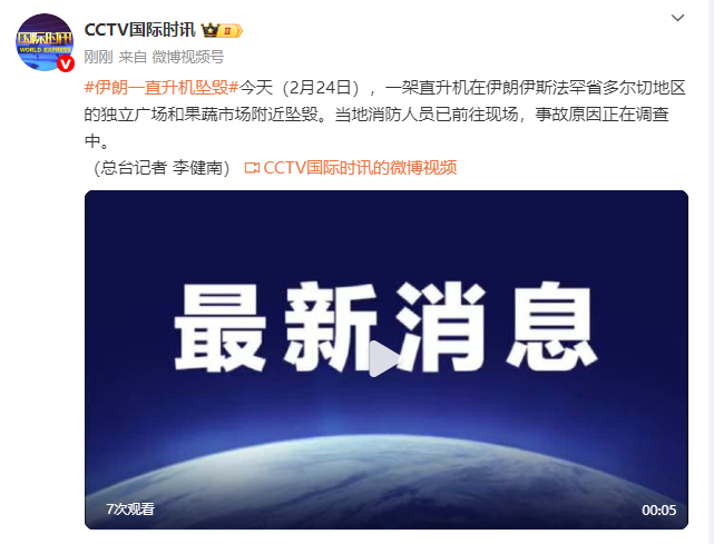 另据@CCTV国际时讯消息,今天(2月24日),一架直升机在伊朗伊斯法罕省多尔切地区的独立广场和果蔬市场附近坠毁。当地消防人员已前往现场,事故原因正在调查中。