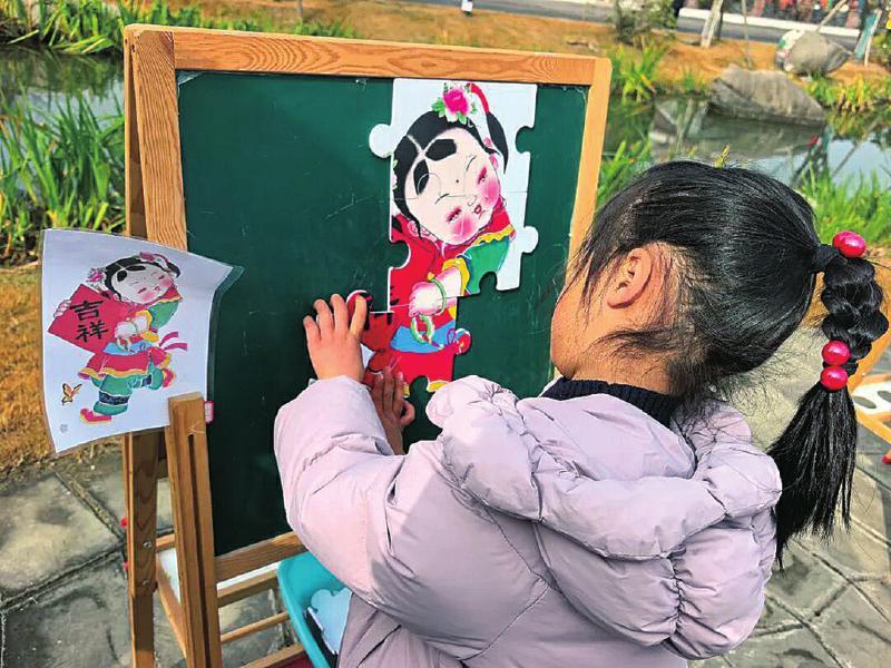 小朋友在体验年画拼图。