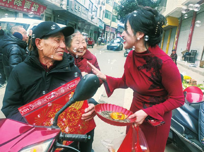 在街头派礼环节,网红达人“小酒窝”用甜美的歌声为乡亲们送上祝福;“天仙镇雯雯”向路人送出糖果瓜子及对联福字,引得过往群众纷纷驻足。