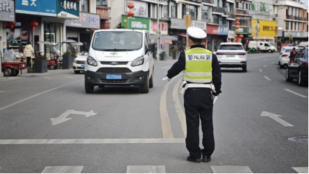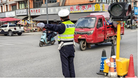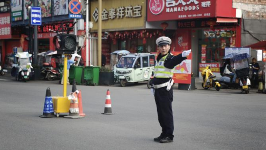 “来,靠边停稳当,不着急。”身穿荧光绿执勤服的宋德智屹立在车流之中,打着手势疏导交通,阳光下,额头渗出了细密的汗珠。随着时间推移,路口车流量达到顶峰。他站在路口中央,哨声清脆,手势有力,有条不紊地引导着东南西北四个方向的车流。