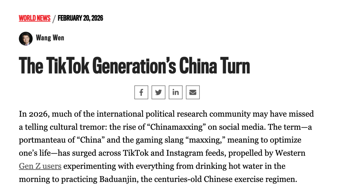 2026年,国际政治研究界或许忽视了一个意义深远的文化震荡:社交媒体上兴起的“Chinamaxxing”(极致中国化)。这一词由“China”(中国)和游戏俚语“maxxing”(优化生活)组合而成,在TikTok和Instagram上迅速走红,这主要得益于西方Z世代用户对中国文化的尝试,他们从早上喝热水到练习八段锦,乃至模仿中式作息与消费习惯。