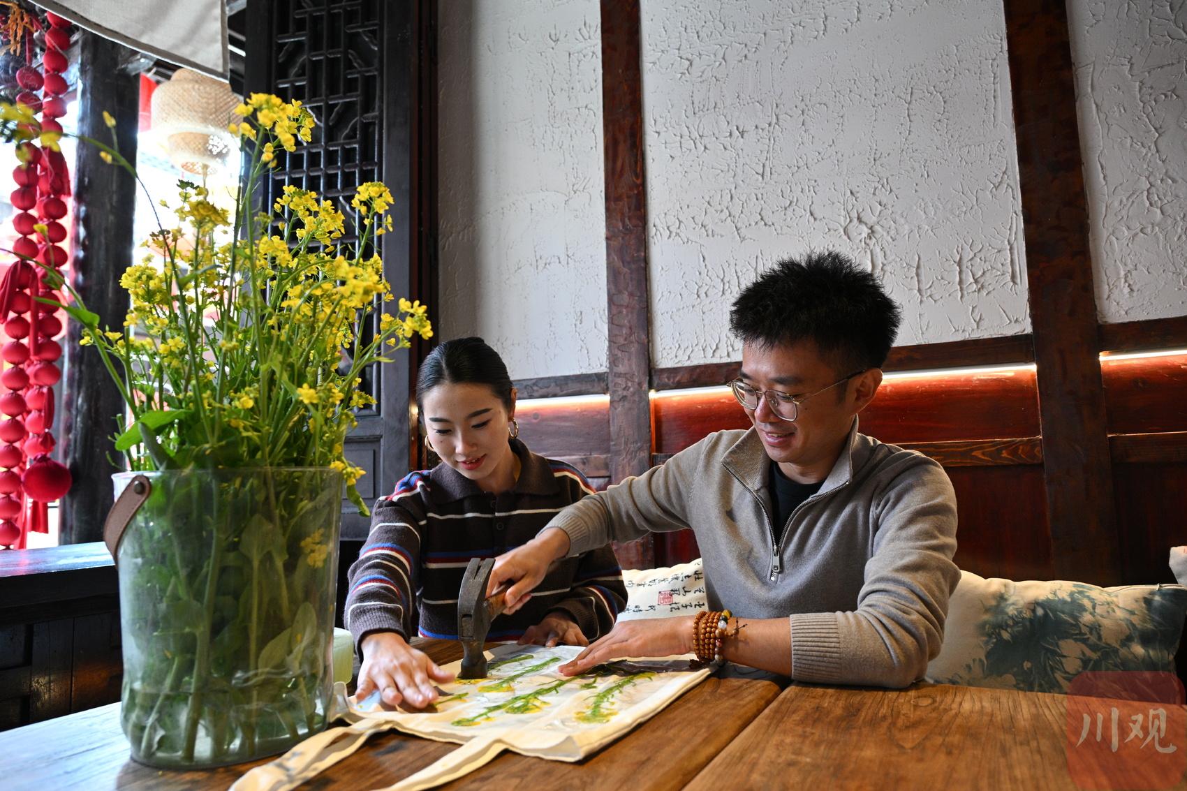 2月25日,德阳市旌阳区孝泉古镇色彩所内,游客们正用亲手采摘的油菜花花瓣制作颜料,欢乐的笑声此起彼伏。今年2月中旬,孝泉古镇以“菜花生活”为基调,创新打造出色彩所、气味所、食物所、彩妆所四个主题“美学实验室”,用创意美学激活乡村旅游,也为当地乡村振兴注入了新活力。