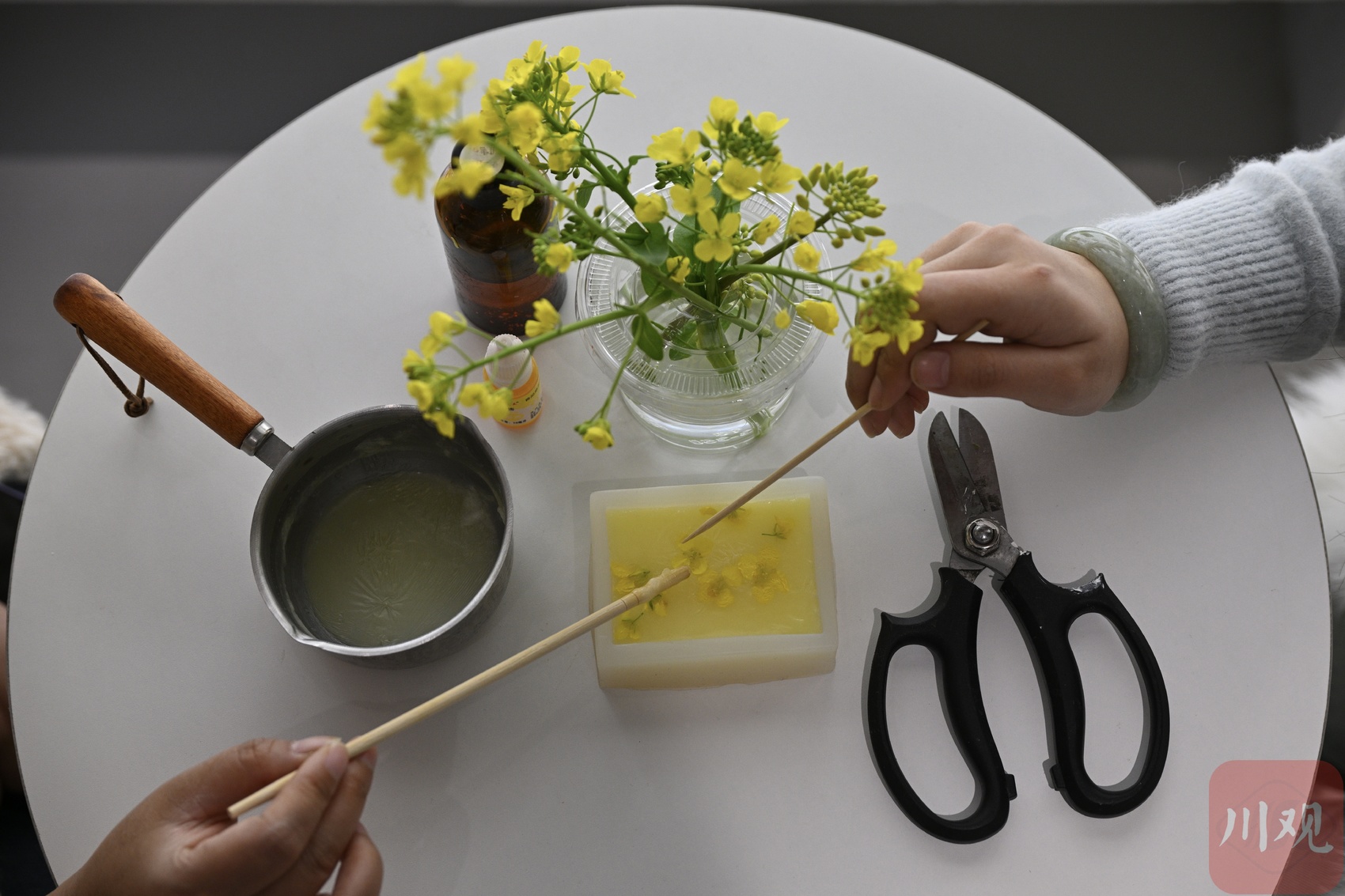 气味所内,游客体验制作菜花手工皂。