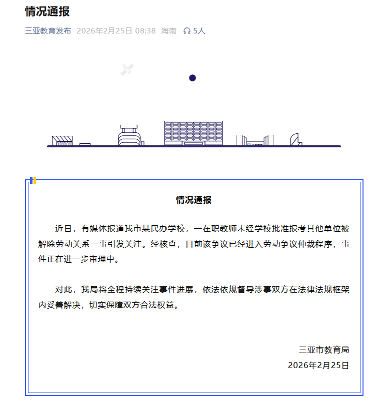 海南省三亚市教育局2月25日就“一在职教师未经学校批准报考其他单位被解除劳动关系”一事发布情况通报,全文如下: