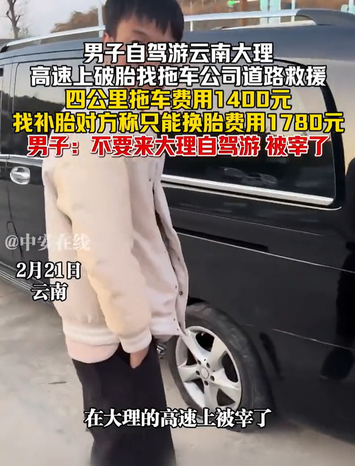 事件简述:2026年2月21日,广东游客陈先生驾车在大丽(大理—丽江)高速公路行驶时车辆突然爆胎,联系上当地一家拖车公司拖车。没想到拖车仅行驶4公里,拖车师傅竟索要1500元拖车费,经协商后,陈先生仍被收取1400元。后续补胎人员收取300元定金后失联,当地维修公司又强制要求换胎并报价1780元,而该款轮胎市场价仅300余元。