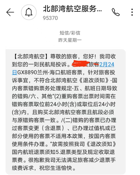事件进展:“航旅纵横”平台客服在回复该网友质疑时表示,手续费标准由航空公司制定,平台仅负责执行。承运方广西北部湾航空有限责任公司(以下简称北部湾航空公司)则回复称,根据该网友购票舱位及退票时间,按规定仅能退还行李额及316元票款。该网友曾向“航旅纵横”所在地的市场监管部门投诉,但被告知应与航空公司联系。2月23日晚,北部湾航空公司再次回应称,该网友情况不符合减免退票费的相关规定,故无法满足其减少退票手续费的诉求。据悉,该网友已向民航局消费者事务中心进行投诉。