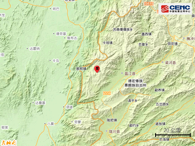 周边县城:震中距盈江县24公里、距陇川县59公里、距梁河县60公里、距瑞丽市78公里、距腾冲市86公里,距德宏傣族景颇族自治州94公里,距昆明市506公里。