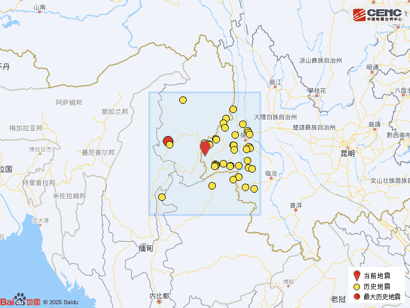 历史地震:根据中国地震台网速报目录,震中周边200公里内近5年来发生3级以上地震共53次,最大地震是2023年5月31日在缅甸发生的5.7级地震(距离本次震中138公里),按震级大小前50次历史地震分布如图。