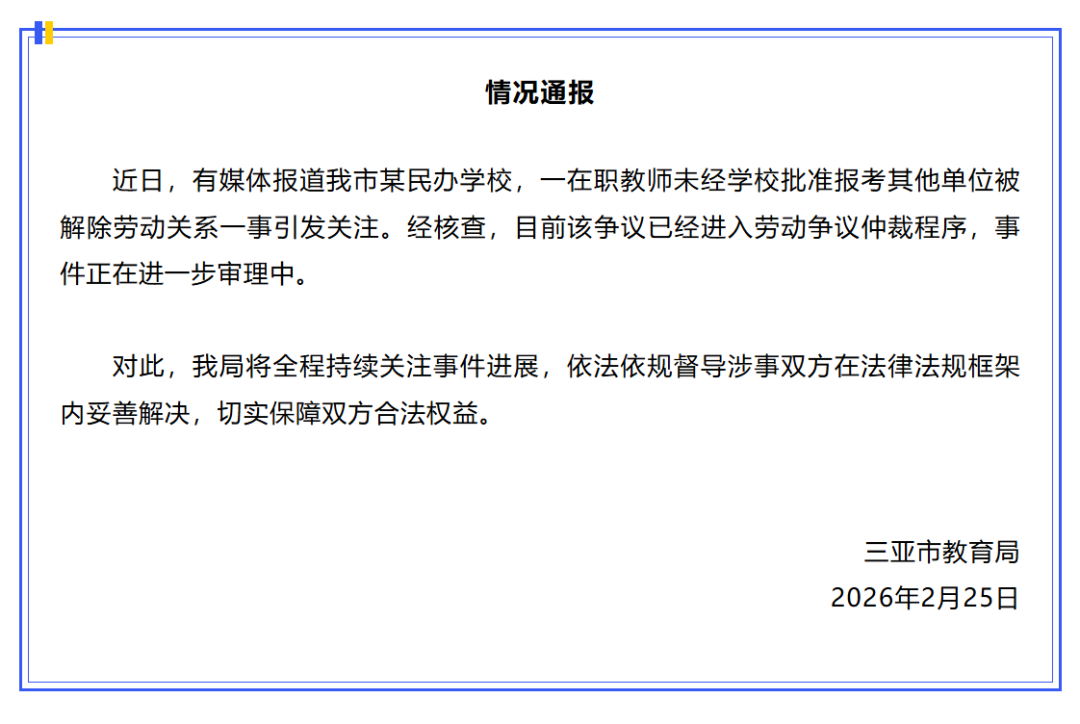 海南省三亚市教育局2月25日发布情况通报: