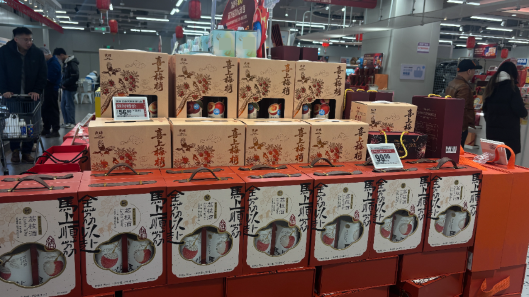 盒马鲜生成都世茂广场店内,“喜上梅梢”青梅酒、马上顺“荔”荔枝酒等果酒礼盒摆放在显眼位置,吸引大量消费者驻足。