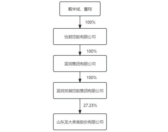 目前,蓝润发展共持有龙大美食27.23%股份,公司实际控制人为戴学斌、董翔夫妇。