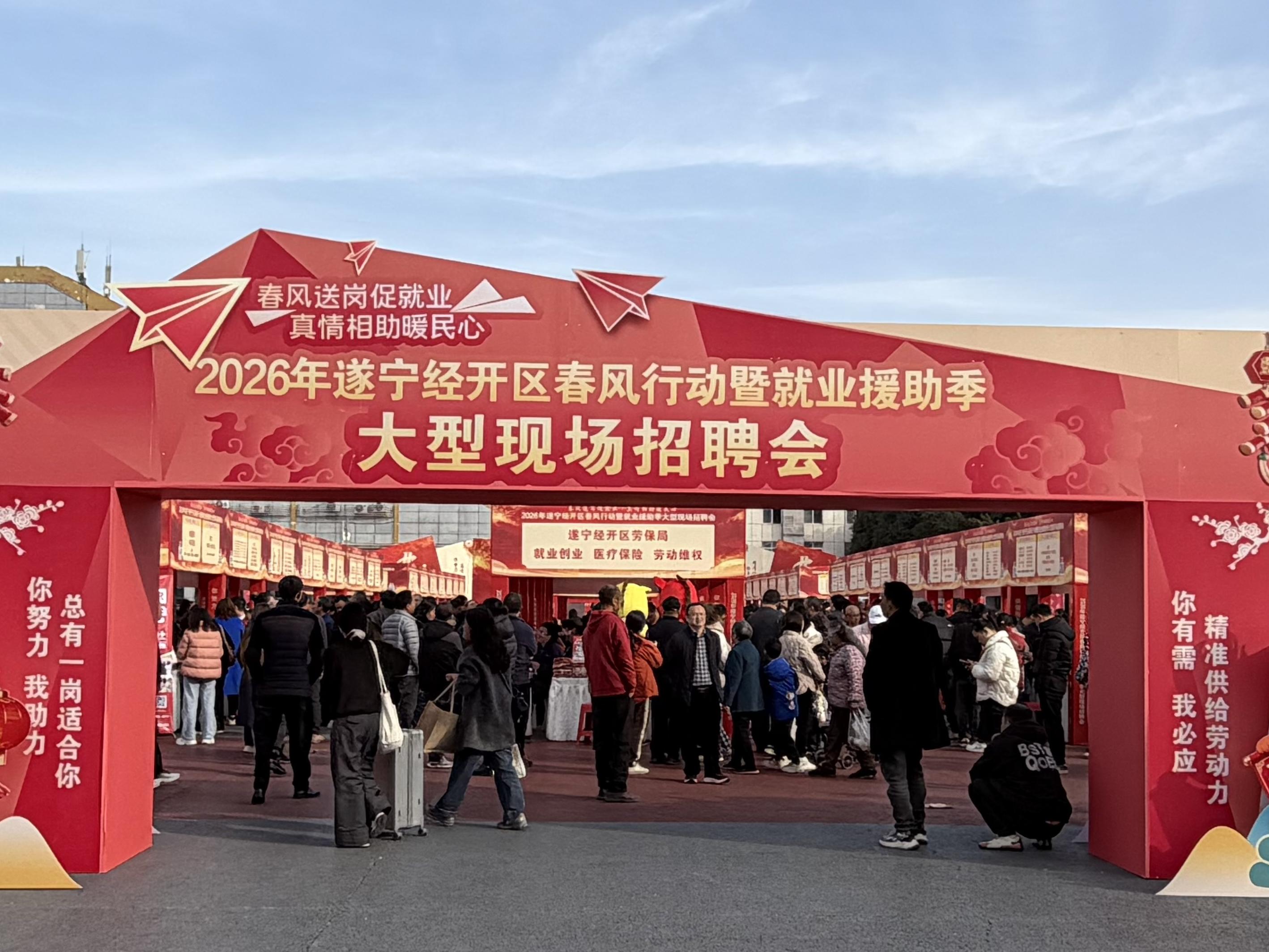 2月25日,2026年遂宁市春风行动暨就业援助季集中推进活动,在遂宁万达广场启幕,400余家企业携2.7万余个优质岗位亮相,累计吸引求职者1.7万余人次,初步达成就业意向7200余人次。