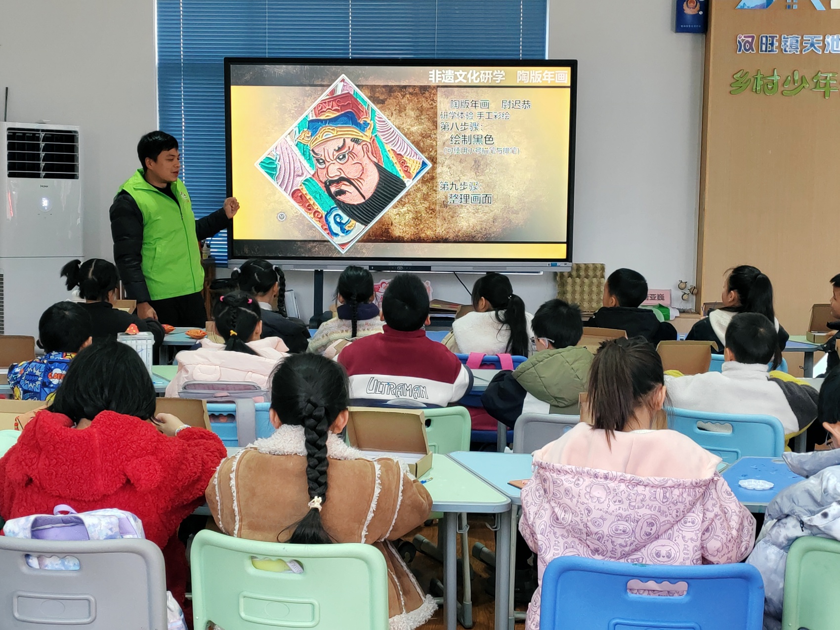 近日,德阳绵竹市的“爱心蜀托”托管班邀请绵竹年画非遗代表性传承人林国栋为孩子们上非遗美学课。