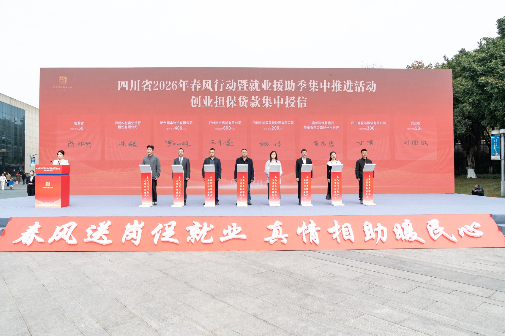为梦想“加油”、为创业“撑腰”的环节将活动推向高潮。泸州农村商业银行、中国邮政储蓄银行泸州市分行等金融机构为申请创业担保贷款的泸州瑞丰物资有限公司等4家企业及创业者代表进行创业担保贷款集中授信。一笔笔“金融活水”精准滴灌,为创业梦想注入强劲动力。