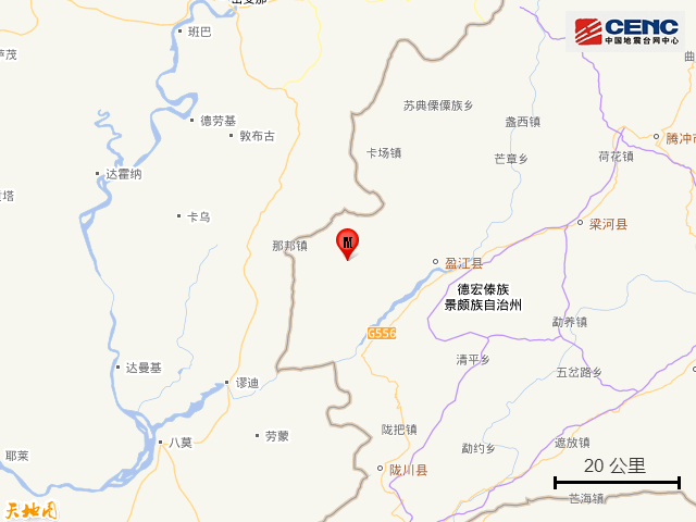 周边县城:震中距盈江县24公里、距陇川县59公里、距梁河县60公里、距瑞丽市78公里、距腾冲市86公里,距德宏傣族景颇族自治州94公里,距昆明市506公里。