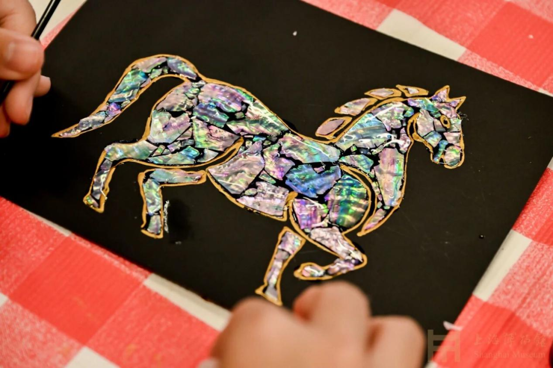 正月初二下午,上海博物馆东馆“玉马驰骋·马年螺钿画手作体验”活动座无虚席。以上海博物馆藏明代及近代玉马为灵感,孩子们用薄如蝉翼的贝壳片,小心翼翼地拼贴出骏马奔腾的轮廓。一个小女孩举着刚完成的作品,兴奋地向妈妈展示:“你看,我的马在奔跑!”那专注的眼神里,是对传统技艺最真诚的喜爱。