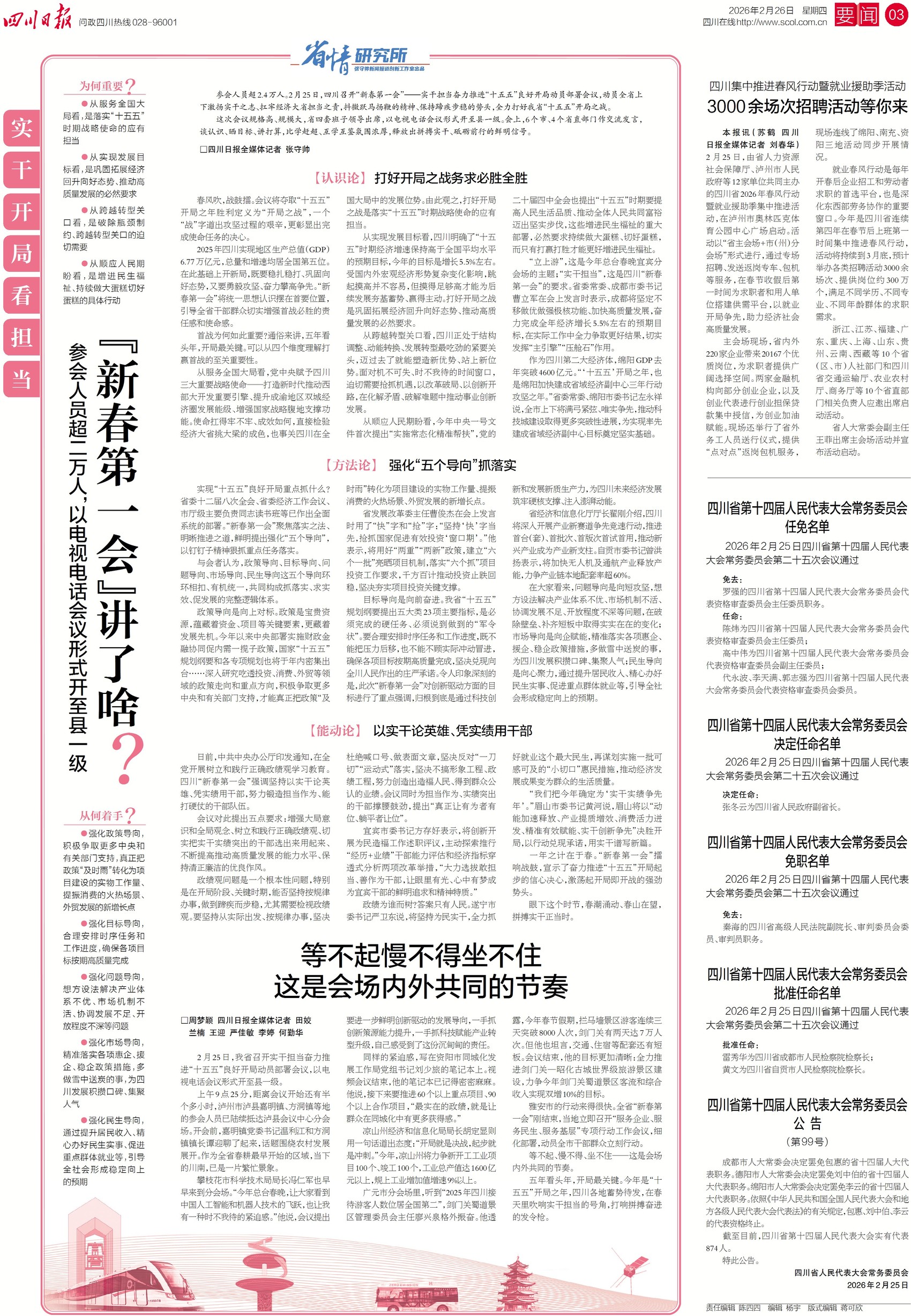 春风吹,战鼓擂。春节假期后的第二天,一场参会人员超2.4万人的“新春第一会”在四川召开,动员全省上下全力打好我省“十五五”开局之战。“十五五”开局之年为何重要,实现良好开局重点抓什么,如何确保开局即开战不走偏,今日川报3版从认识论、方法论、能动论三个方面为你揭晓答案。
