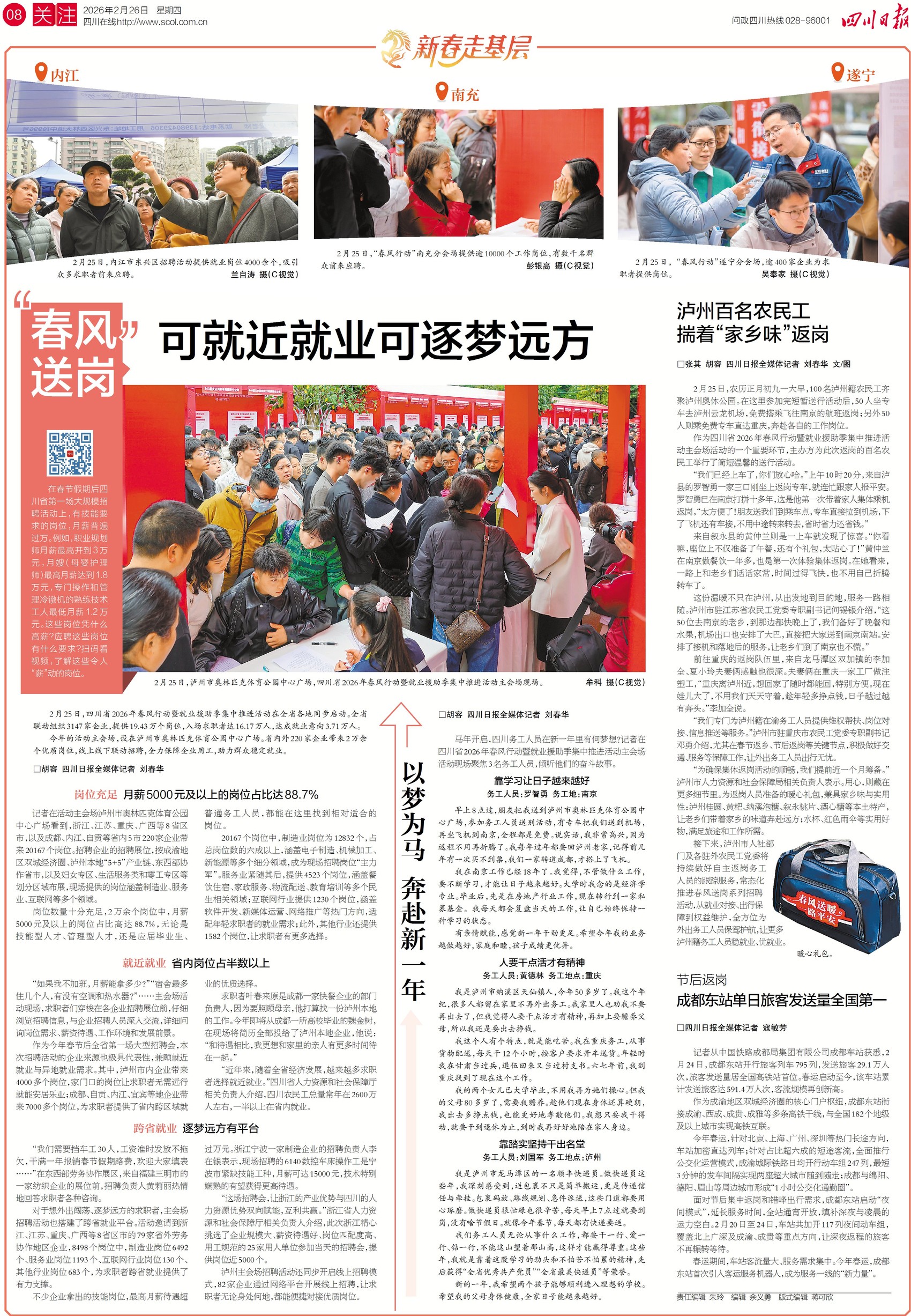 3147家企业、19.43万个岗位,16.17万人参加、达成就业意向3.71万人……2月25日,四川省2026年春风行动在全省各地同步启动,将持续到3月底,预计举办各类招聘活动3000余场次、提供岗位约300万个,不管是就近就业,还是逐梦远方,这场招聘会都能为你提供选项。关注今日8版了解详情。