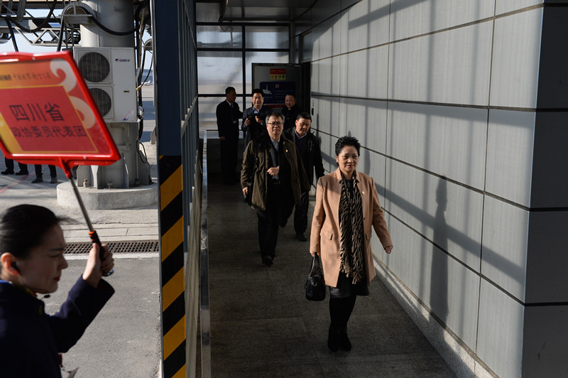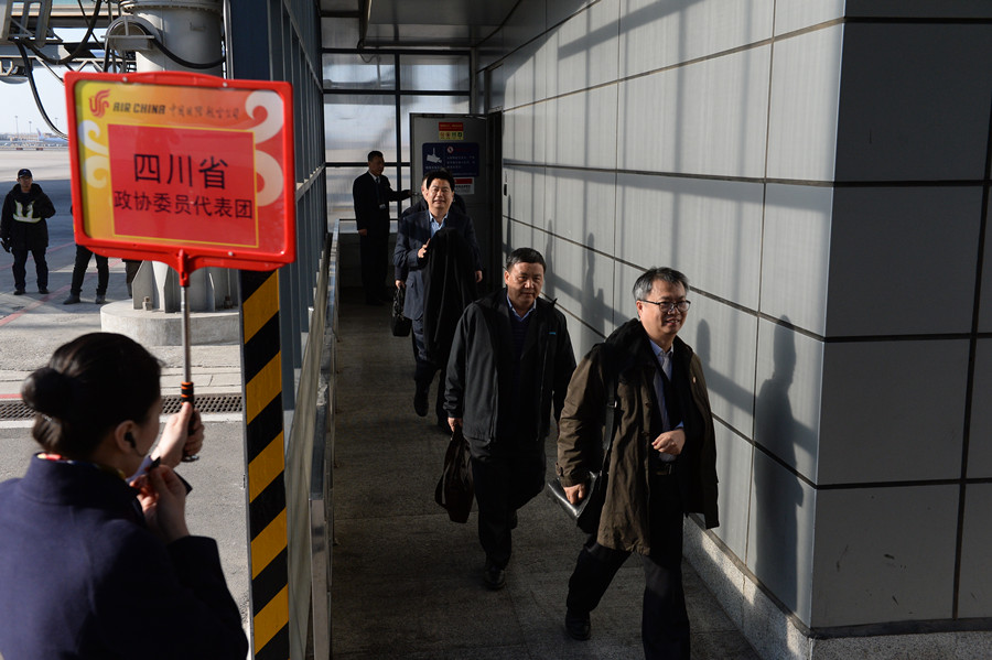 3月1日,参加全国政协十三届一次会议的继任住川全国政协委员们抵达首都机场。