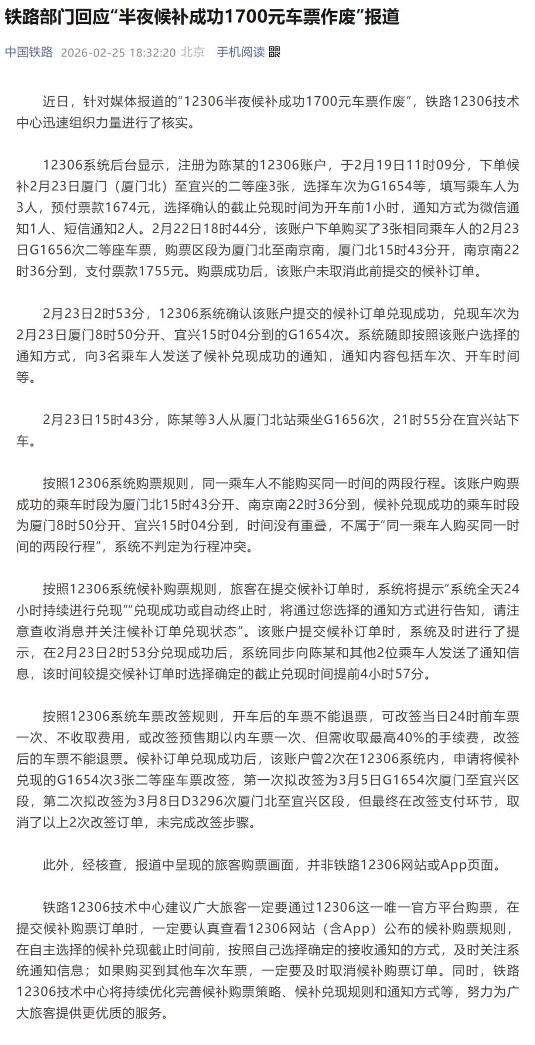 据“中国铁路”微信公众号消息,近日,针对媒体报道的“12306半夜候补成功1700元车票作废”,铁路12306技术中心迅速组织力量进行了核实。