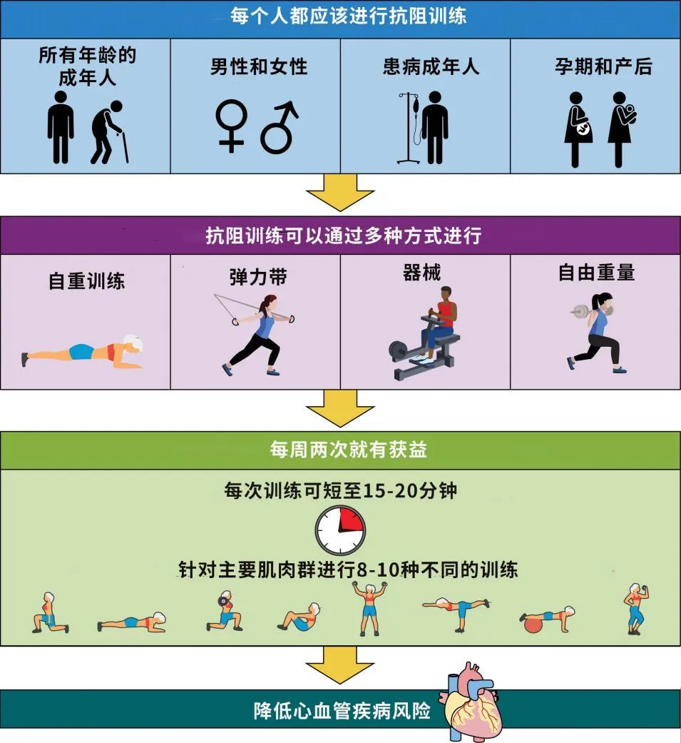 建议抗阻运动和有氧运动结合。每周≥2次抗阻训练,可有效实现肌肉和心血管获益。