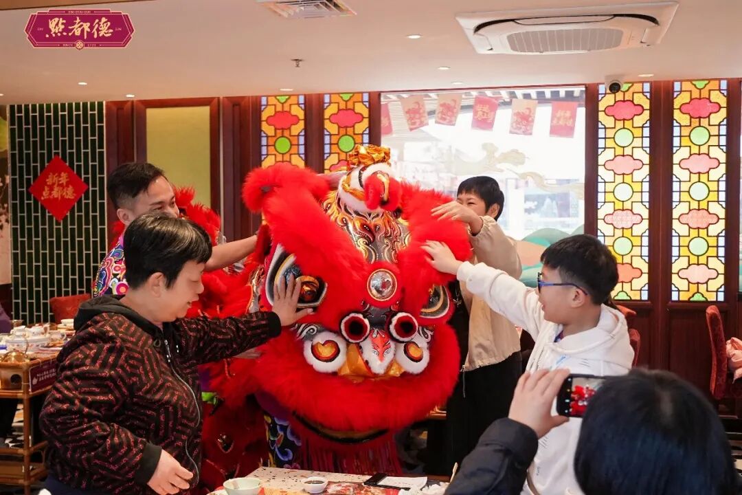 点都德的舞狮表演期间,客人摸摸狮头。受访者供图