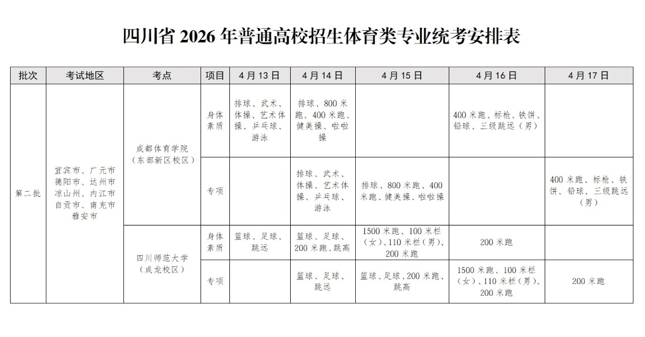 四川省2026年普通高校招生体育类专业统考(以下简称体育类专业统考)将于4月8日至17日分别在成都体育学院(东部新区校区)考点(地址:成都市东部新区环湖北路1942号)和四川师范大学(成龙校区)考点(地址:成都市成龙大道二段1819号)举行。