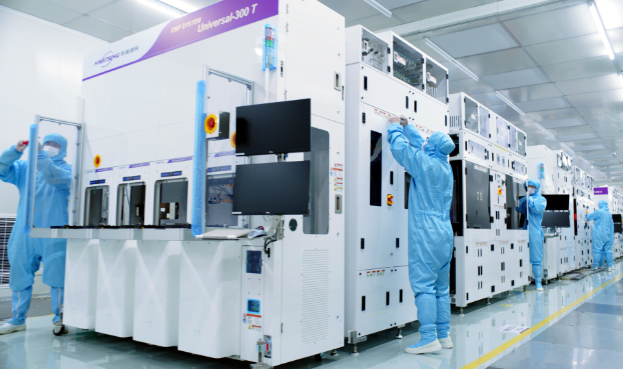 华海清科股份有限公司运营制造部员工在千级无尘室进行机台调试工作。