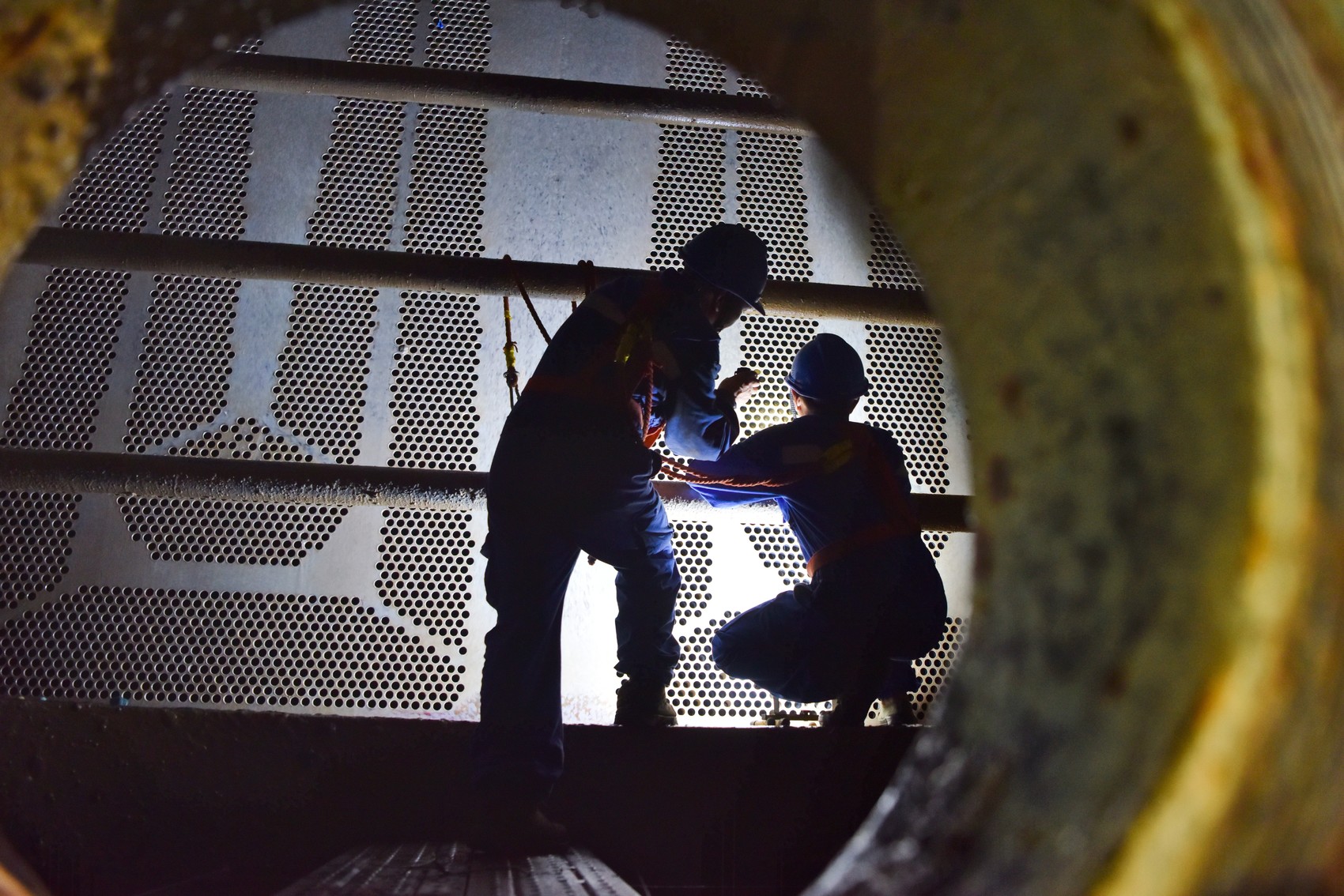 四川泸州川南发电有限责任公司机务专业人员正在检查吹扫过的凝汽器管道。
