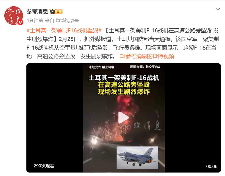 2月25日,据外媒报道,土耳其国防部当天通报,该国空军一架美制F-16战斗机从空军基地起飞后坠毁,飞行员遇难。现场画面显示,这架F-16在当地一高速公路旁坠毁,发生剧烈爆炸。
